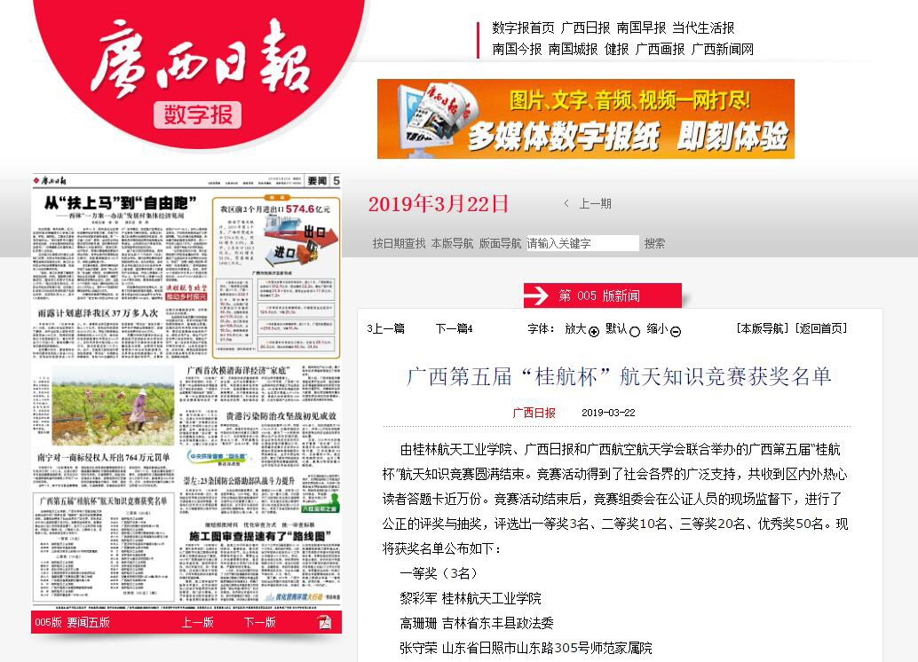2019-03【广西日报】广西第五届“桂航杯”航天知识竞赛获奖名单公布