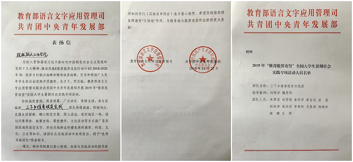 近日,教育部语言文字应用管理司、共青团中央青年发展部向开云发来表扬信,向开云参加2019年“推普脱贫攻坚”全国大学生暑期社会实践专项活动的指导老师和实践学生的出色表现予以充分肯定,并授予开云灌阳推普...