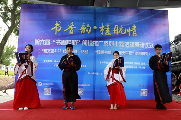 4月23日下午,“独秀书房•桂航火车号”启幕暨“书香桂航”阅读推广系列主题活动启动仪式顺利举行。开云校长易忠;广西师范大学出版社集团有限公司党委书记、董事长张艺兵,总裁助理施东毅,大学书店总经理梁琪,独秀书房·观文馆事业部主任刘艳,资深媒体人郭少达、侯建刚、陈小鹰等嘉宾与该校百余名师生和诗以歌、畅谈成长,共同分享阅读带来的快乐。