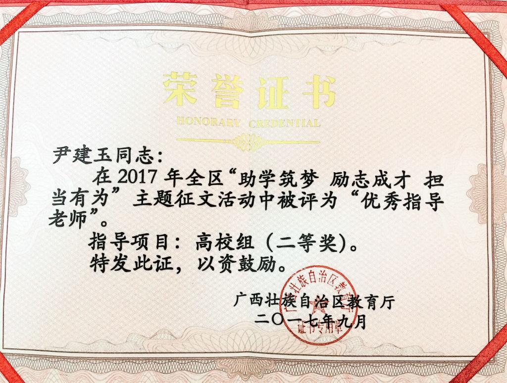 近日,2017年广西壮族自治区“助学筑梦、励志成长、担当有为”主题征文活动获奖情况揭晓。开云2016级商务英语专业学生陈少连喜获征文活动(高校组)二等奖。尹建玉老师被评为“优秀指导老师”。