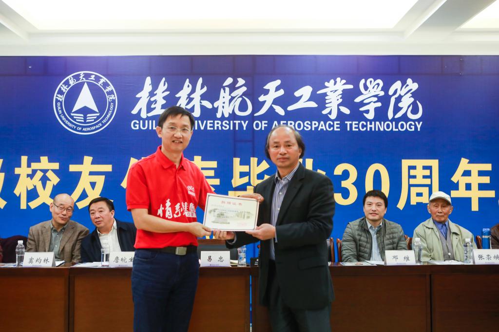 为表达对母校的感恩,校友们集体为母校校史馆捐赠了“航天员训练服”、“歼20隐形战斗机模型”,学校领导、老师为校友们佩戴校徽、颁发校友捐赠证书。同时,鉴于86级校友的发展成就及对母校的深厚情谊,学校特聘请862班卢崇元、865班许世安等8位校友分别担任管理学院、计算机科学与工程学院8个班级的“校友导师”,负责协助母校引领学生成长成才。易忠为他们颁发了聘书。