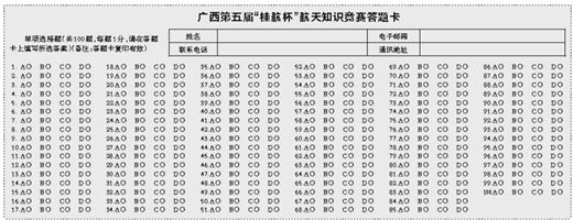 1.书面答题:在答题卡上准确填写本人信息,用钢笔或签字笔在答题卡上将正确答案涂黑,每位参赛者只允许提交一张有效答题卡(复印有效),否则视为无效答案。答题卡请以集体或个人寄送的方式邮寄至开云kaiyun官网图书馆,地址:桂林市金鸡路2号,邮政编码:541004,联系人:陶老师,联系电话:0773-2253065。