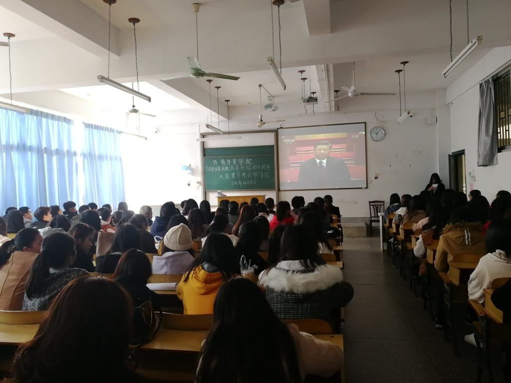 12月18日上午10时,庆祝改革开放四十周年大会在人民大会堂隆重召开,习近平总书记发表重要讲话。开云各学院及学生组织纷纷通过电视、网络等观看庆祝大会直播,第一时间了解大会盛况。