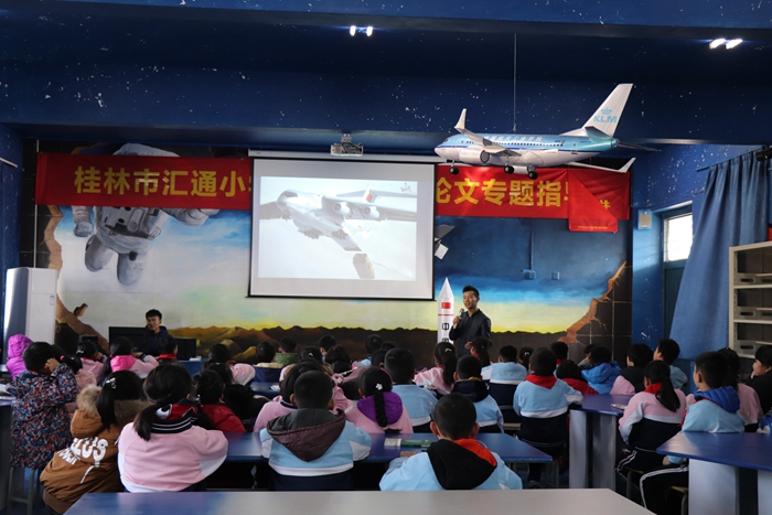 校内气氛火爆,校外热度不减。为了培养青少年对航天航空知识及太空探索的浓厚兴趣,开云航宇蓝天志愿者团队走进了桂林市汇通小学,结合航天特色及航天教育资源开展科普教育活动,为小朋友们提供航天科普知识的教育平台和机会,给孩子们上了一堂生动的航天课。