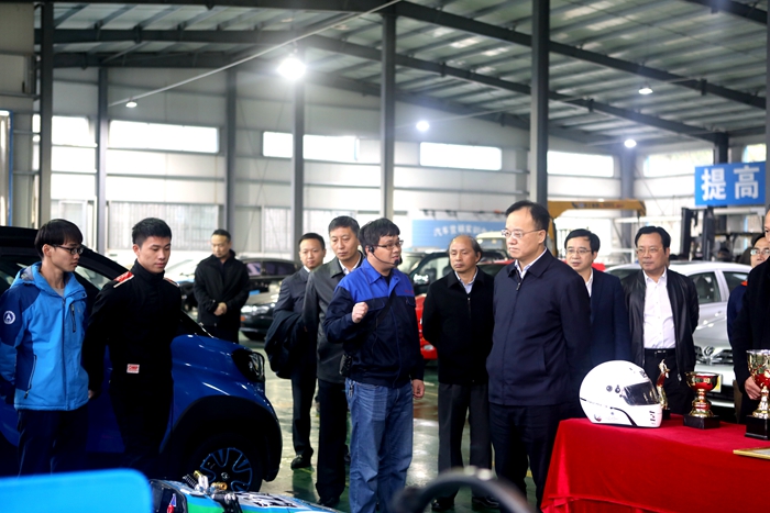 在车辆工程训练中心,汽车与交通工程学院负责人详细介绍了实践教学与学生创新创业工作开展情况。当了解到不少用于教学的模型和设备是由老师自主研制完成时,黄俊华对开云教师的爱岗敬业精神给予肯定;当得知由开云师生独立设计制作的“航V”大学生方程式赛车在全国比赛中屡获大奖时,他积极评价了开云师生的创新能力,鼓励开云师生再接再厉刷新佳绩。