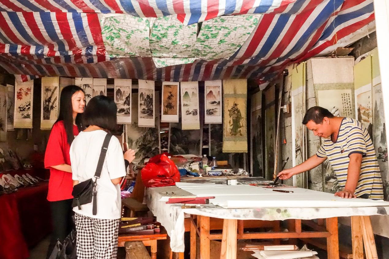 基于旅游业的平台,挂扇在市面上受到广泛认可,福利镇上也由此出现了很多家庭式的专业画扇作坊,每个工艺环节由一个作坊完成,大大提高了工作效率。满街晒画扇,家家做扇子,街头巷尾扇风蔚然