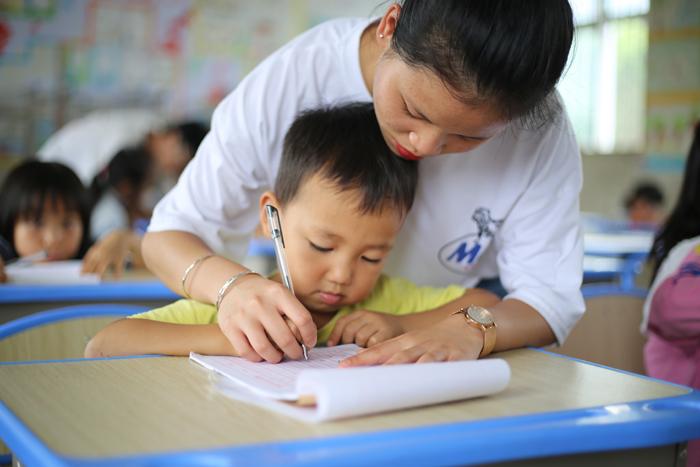 手把手执笔,拉进与小朋友们的距离。 罗广焜 摄