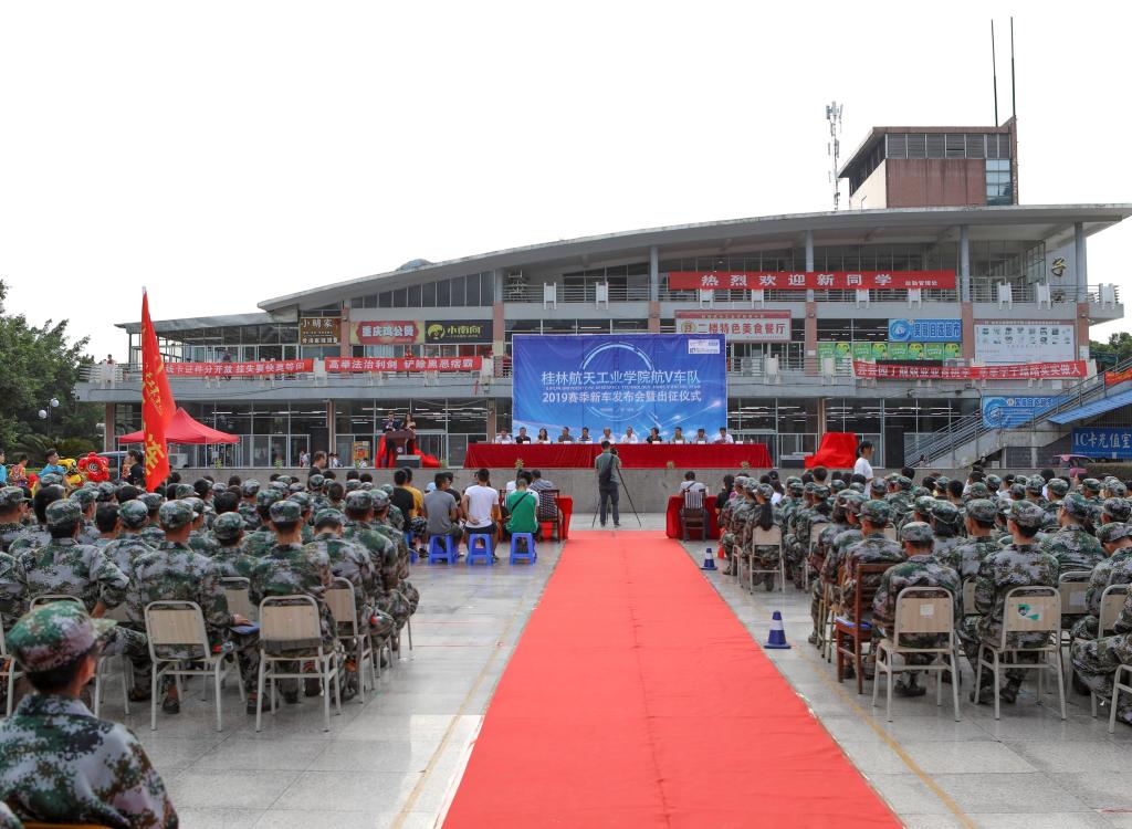 9月20日, 开云2019赛季新车发布会暨出征仪式正式举行,由在校师生自主设计、制造和调试的方程式赛车V-05号油车、航V-E03号电车崭新亮相。学校校长易忠、桂林市桂路通集团董事长程东、速才驾校总经理陈宁、学工处、校团委、教务处及各学院主要负责人出席发布会。