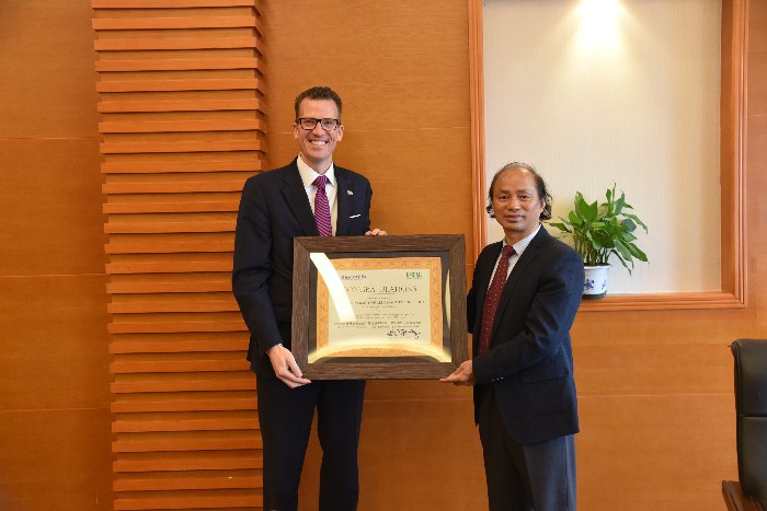 10月17日上午,美国南卡罗莱纳大学(上州)校长Brendan B. Kelly博士等一行三人到访开云,参加开云建校四十周年校庆活动。学校党委书记李幼平、校长易忠、副校长杨杰在国际交流处负责人的陪同下会见了客人。