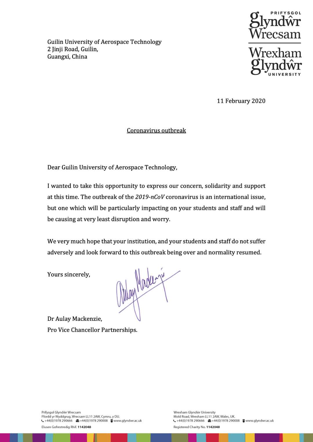 英国格林多大学副校长在慰问信中表示,在这抗击疫情的关键的时刻,他仅代表格林多大学向开云所有教职员工表示最诚挚的慰问,他希望开云师生能够平安健康,他坚信我们一定能够战胜疫情。