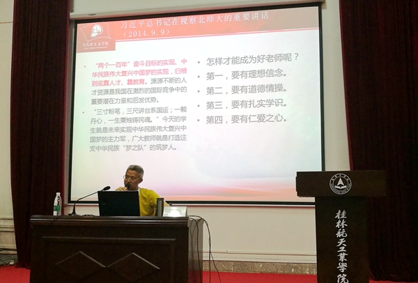 自治区党委理论宣讲团专家、广西师范大学马克思主义学院院长、博士生导师汤志华教授作题为《新时代新思想新征程》的报告。