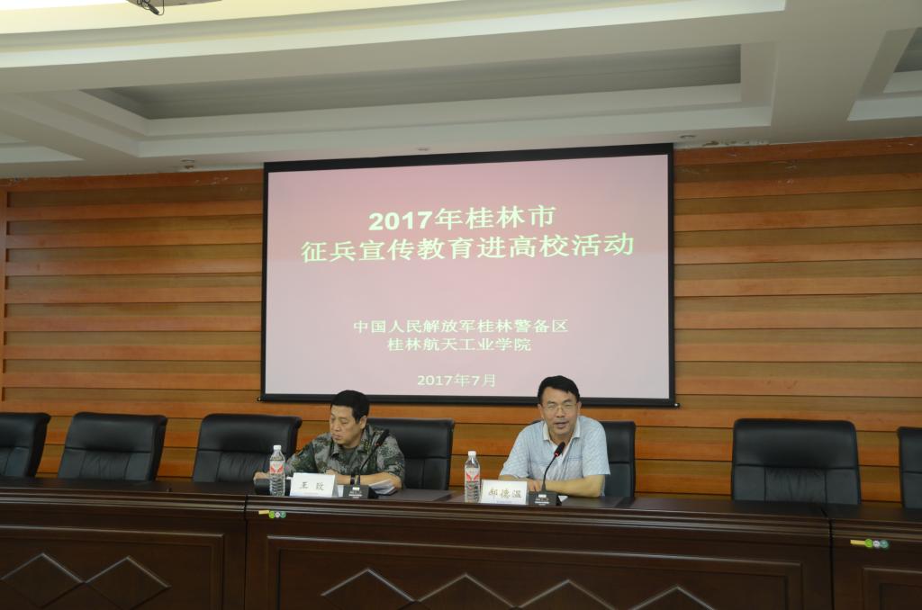 7月6日上午,2017年桂林市征兵宣传教育进高校活动在开云飞天楼520会议室举行,桂林警备区政委王致、警备区动员处处长田应军、七星区人民武装部部长张松军、七星区人民武装部政委周足根、学校副校长郝德温出席了活...