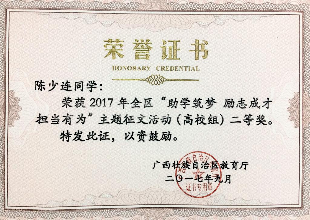 近日,2017年广西壮族自治区“助学筑梦、励志成长、担当有为”主题征文活动获奖情况揭晓。开云2016级商务英语专业学生陈少连喜获征文活动(高校组)二等奖。尹建玉老师被评为“优秀指导老师”。据悉,此次广西资...