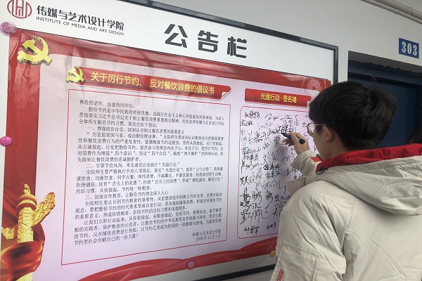 近日,为深入贯彻习近平总书记对制止餐饮浪费行为作出的重要批示,传媒与艺术设计学院向全院在校生发出“厉行节约、反对浪费”的倡议书,并组织同学们进行签名承诺活动。活动中,该院学生代表向同学们宣读了“厉...