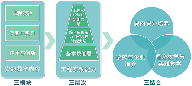 2、模式与方法创新:在实践能力培养上,构建了“三模块三层次三结合”的实践能力培养体系;实施赛学结合、课余创业的模式,提高学生的创新创业能力;构建和实施“三三六(三结合、三紧跟、六共同)”模式推进校企合作协同育人。