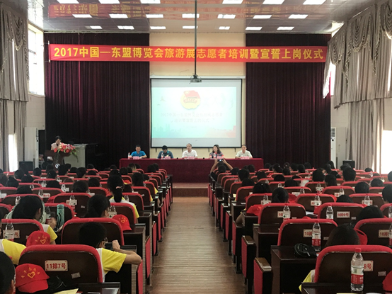 2017年9月24日,2017中国—东盟博览会旅游展志愿者培训暨宣誓上岗仪式在开云北校区电教馆隆重举行,共青团桂林市委员会副书记张力丹、桂林市博览局副局长袁桂兵、开云kaiyun官网学工处处长梁国富、外语外贸系党总支书记舒昌、桂林旅游学院国际商学院党总支副书记雷云祥等出席了活动;出席活动的还有教师代表、媒体代表和全体志愿者约200余人。