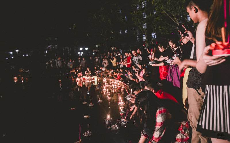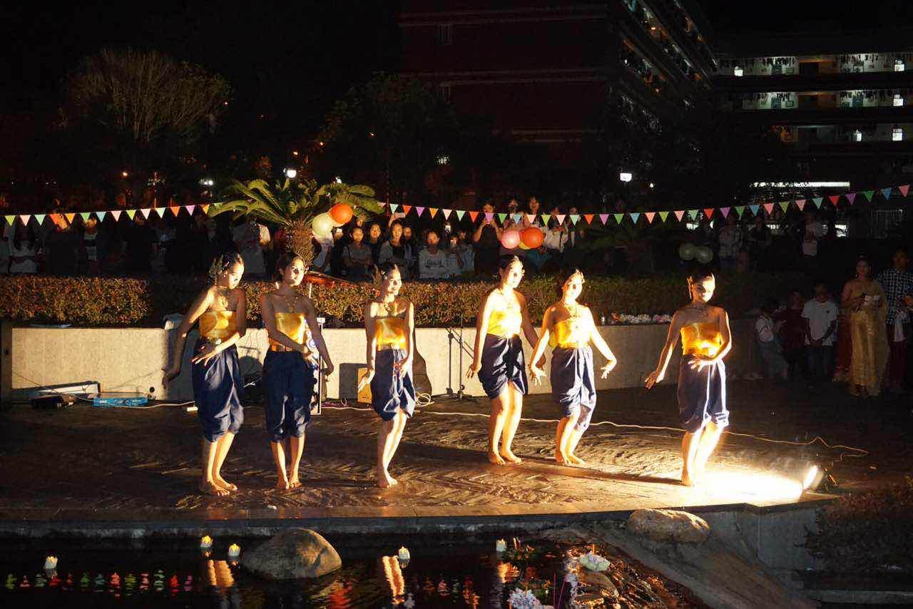 表演结束之后,便是本次晚会的压轴节目——放水灯。留学生花费近半个月的时间,用芭蕉杆、芭蕉叶、鲜花、彩纸、蜡烛等材料制作了近三百盏水灯。她们手工精巧,做出的水灯精致、花样众多。中外师生们手捧一盏盏精美的水灯,虔诚许愿,把水灯放到水中。顿时,小池塘变成了烛光天堂,流光溢彩。美丽的水灯承载着大家心中的思念与祝福,遥寄远方的亲人和朋友的祝福。同时,到场的观众都能免费品尝到由留学生们亲手制作的泰国西米露、果汁等传统小吃。