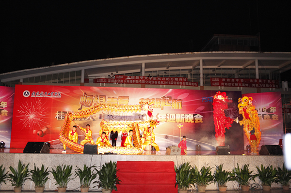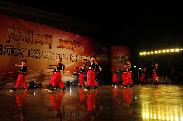 整台晚会气氛热烈,节目精彩纷呈,璀璨的灯光交相辉映,歌曲、舞蹈、合唱等各种形式的节目先后亮相,现场汇聚成一片欢乐的海洋。首先是一场活力四射的军训拉歌拉开晚会的序幕,4000多名2015级新同学热情高歌,展现青春风采。随后,学长学姐们为新生精心准备的各类节目轮番上演,激起现场阵阵喝彩。武术协会带来的舞龙舞狮表演热情奔放;大学生艺术团及音乐协会一展歌喉,歌曲串烧《dream》曲韵悠扬、娓娓动听;萨克斯、古筝、钢琴演奏《青花瓷》深情款款、掷地有声;能源与建筑环境学院带来的荧光舞表演气势不凡,深得观众的喜爱;跳跃的音符搭配动感的舞姿,街舞表演现场欢声雷动、鼓乐齐鸣;武术协会上演《桂航武魂》,将中华武术的博大精深诠释得无比美妙。来自留学生的东南亚风情舞蹈更是引爆全场,将晚会气氛推向高潮。