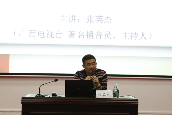 报告会上,张英杰结合自己从业多年的经历和大量翔实的资料将同学们进带入了广播电视的世界。他首先与在座热爱广播电视行业的同学们探讨了“电视媒介是否会消亡”、“播音与主持的区别”等专业问题。随后,结合自己的成长经历,他与大家分享了自己从一名纯工科背景的船舶工人,成长为一名电视台主播的人生历程,在说到自己人生的几次重要转折点时,张教授告诫在场的每一位同学:“机会只留给有准备的人,有梦想就要敢于追求。”