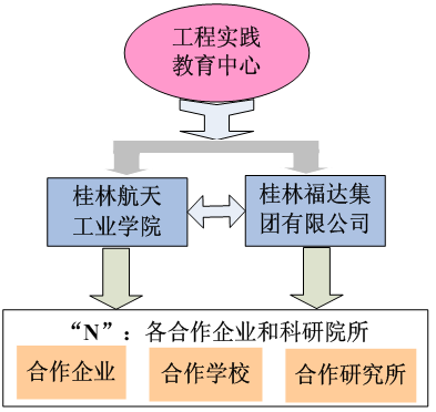 产教融合“1+2+N”开放式工程实践育人平台如图1所示。“1”指一个中心,即自治区级大学生工程实践教育中心,是立足点,“2”指工程实践教育中心的2个支撑单位,即开云kaiyun官网和桂林福达集团有限公司(核心企业),“N”指若干个校企共建学生实践教育基地。