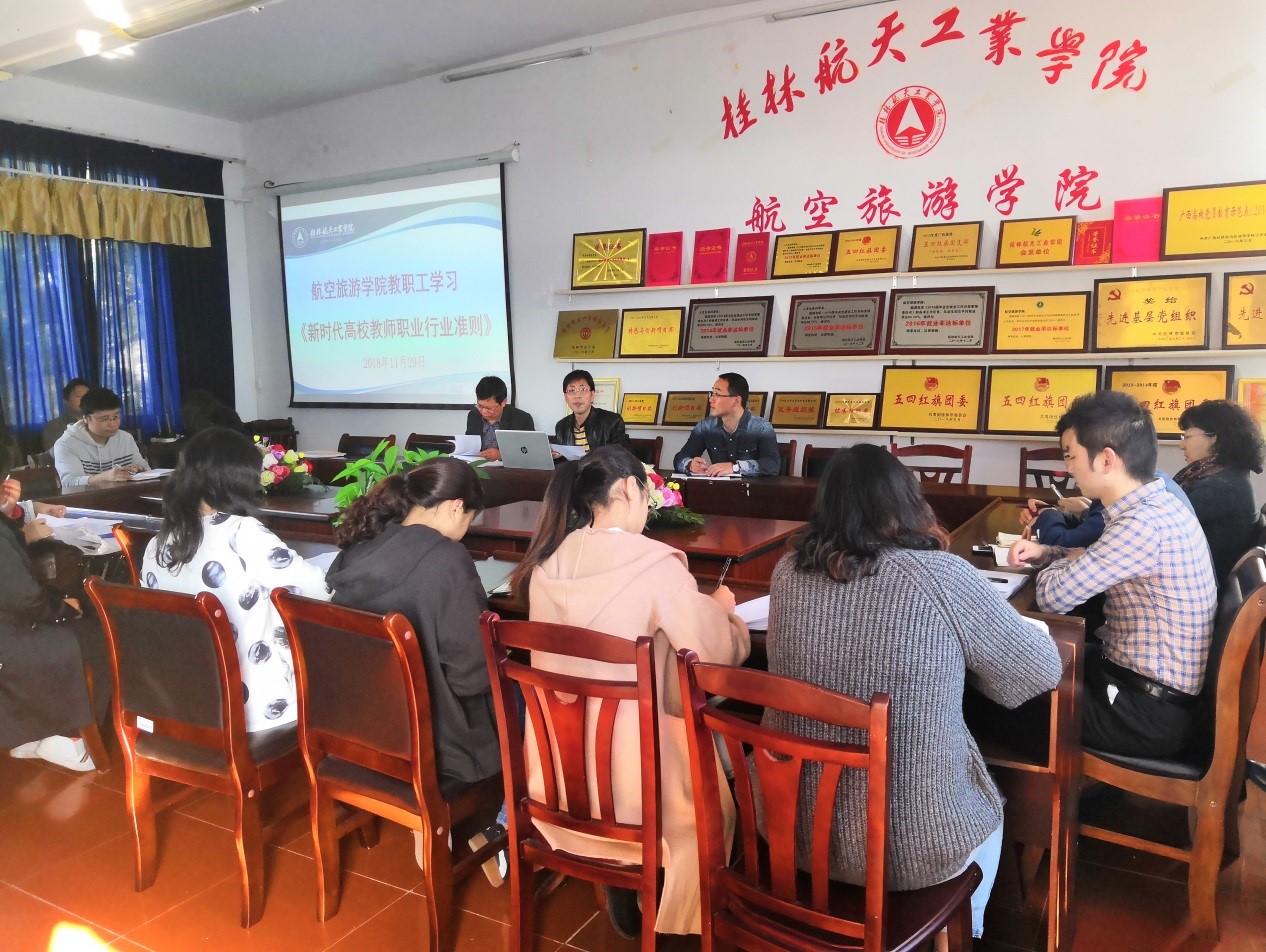 11月29日,航空旅游学院在一号办公楼306会议室,集体学习习近平总书记关于高校教师队伍建设的重要指示精神和教育部《关于建立健全高校师德建设长效机制的意见》、《新时代高校教师职业行为十项准则》等通知文件。学院党总支书记、院长王凯,党总支副书记张海涛,副院长林朝阳以及全体教职员参加学习讨论活动。