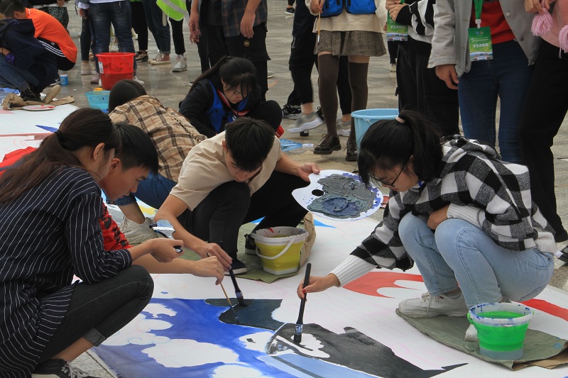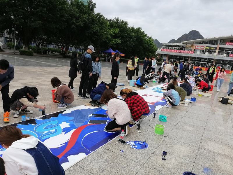 青春广场上,传媒与艺术设计学院96名师生在长达40米的画布上进行了主题为“薪火相传 筑梦蓝天”的现场即时绘画活动,现场绘画时长4个多小时,引来了众多校友和师生观赏。40米长卷上,一笔一画描绘出桂航师生对桂航未来发展的追求和对蓝天的热爱与向往。从盘古开天辟地到天宫一号翱翔宇宙,从观星台浑天仪到宇宙飞船射电望远镜,从嫦娥奔月到航天英雄杨利伟返航,历史与现代交融,每一幅画都饱含着桂航师生、校友对国家对桂航浓浓的深情与热爱。