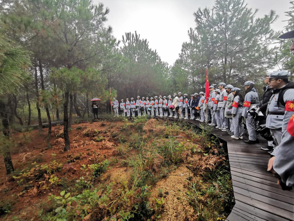 活动内容的设计着重突出红色革命文化“体验式”教学。在园区工作人员的带领下,支部党员们前往炮楼山,实地参观新圩阻击战战壕遗址,并从钟山开始,徒步行走至枫树脚,重走当年红军战士走过的长征路,切身体会战役的惨烈和胜利的来之不易。