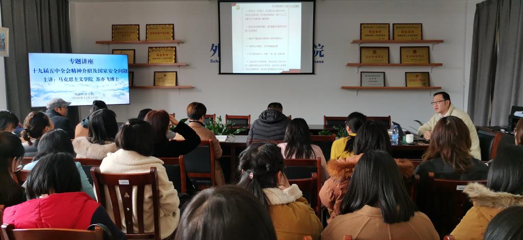 12月10日,外语外贸学院党总支邀请马克思主义学院苏亦飞博士为学院全体党员同志作了一次主题为“十九届五中全会精神介绍及国家安全问题”的专题讲座。