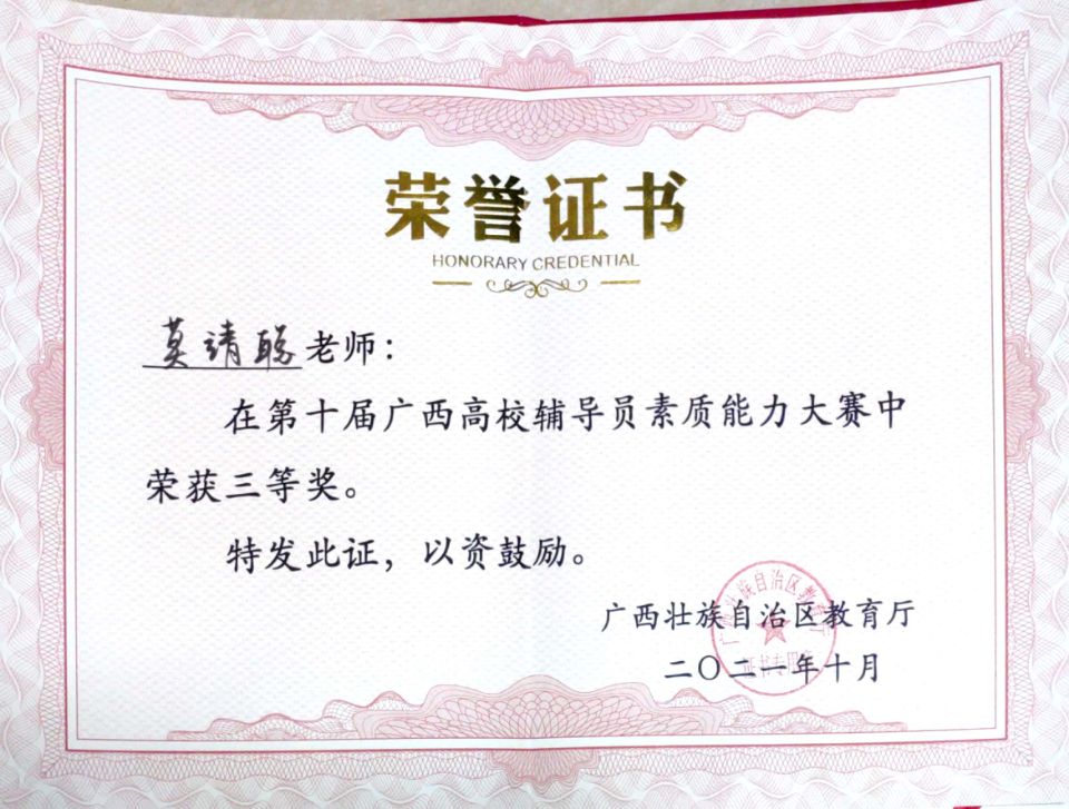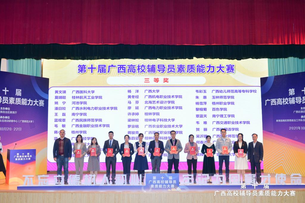 10月20日至22日,由自治区教育厅主办,教育部高校思想政治工作队伍培训研修中心(广西师范大学)承办的第十届广西高校辅导员素质能力大赛在广西师范大学育才校区举行,来自全区各高校81位选手参加比赛。开云管理学院辅导员莫靖聪荣获大赛三等奖。