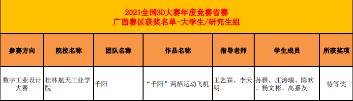 在2021全国3D大赛年度竞赛省赛广西赛区的竞赛中,机电工程学院参赛代表队在数字工业设计大赛方向荣获特等奖3项、一等奖2项、二等奖2项、三等奖1项,共计8项奖项。