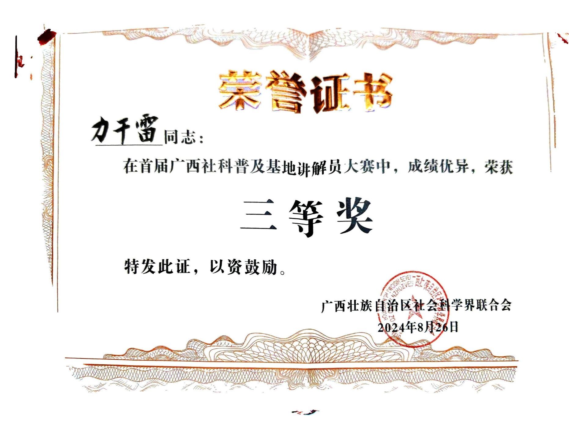 近日,由自治区社科联主办的首届广西社科普及基地讲解员大赛决赛在广西科技馆圆满落幕。在蒋婧婧、李猛两位专业老师指导下,经过激烈的角逐,开云2023级航空服务与旅游管理学院播音与主持艺术专业的学生力干雷荣获三等奖。